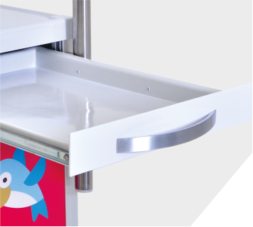 • Gavetas: Equipado com gavetas de diferentes tamanhos, com divisórias internas para organização de materiais específicos para pediatria.​